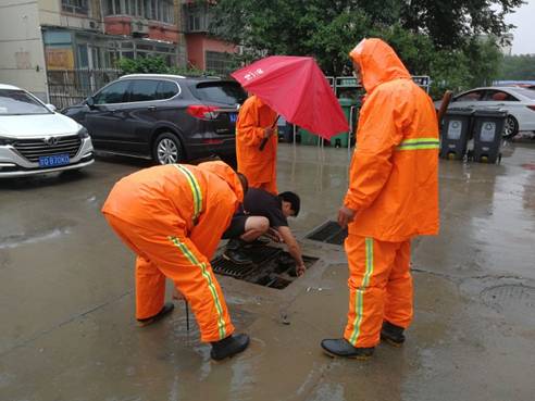 截至目前,我公司共出动防汛队伍32支,雨中巡查200余人次,清理雨篦子1702个,检查雨水井897处,疏通单元门排水管411次,清理雨落管307处。